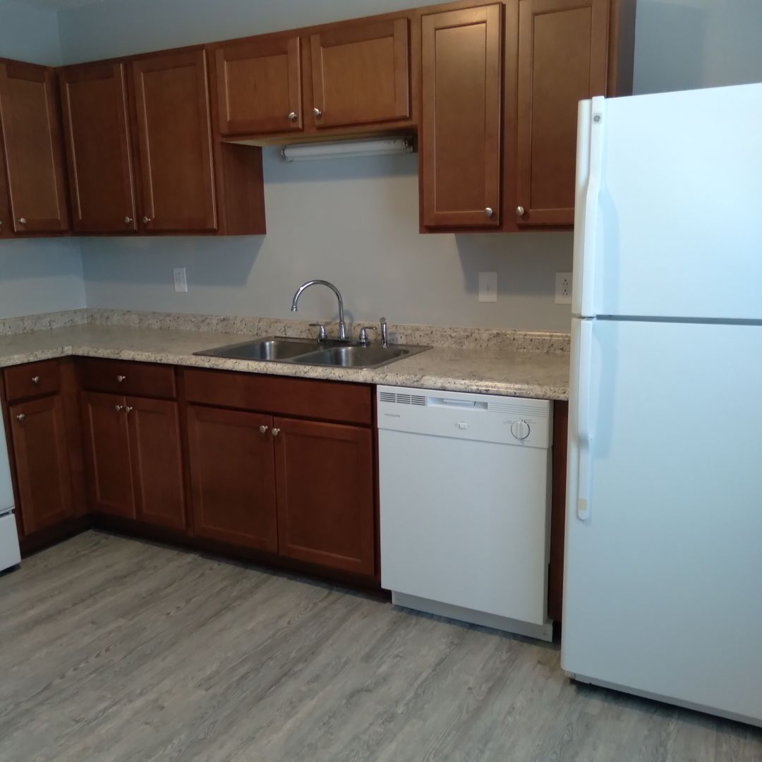 2 Bedroom, one bath with eat in kitchen, and large walk in closet in master bedroom. Unit includes stove, refrigerator, dishwasher and washer/dryer hookups. Lawn care is included in rent. Unit has back porch with a locked 5'8 x 4'3' storage area. Wood look vinyl flooring in living room, kitchen and bathroom.